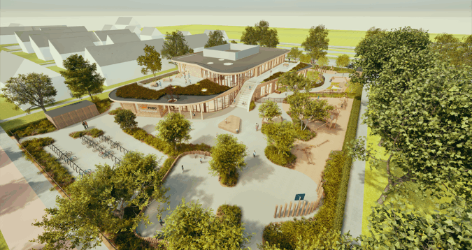 Het nieuwe Kindcentrum wordt een warme, huiselijke plek waar leren en natuur naadloos samenkomen. Binnen en buiten vloeien in elkaar over, dankzij een paviljoenachtig ontwerp met ronde hoeken, transparante gevels en houten kolommen. Een doorlopende houten luifel, organische buitentrap en ruime dakterrassen zorgen voor een open en uitnodigende uitstraling. Het is een plek die kinderen uitnodigt om te ontdekken, te spelen en te groeien.