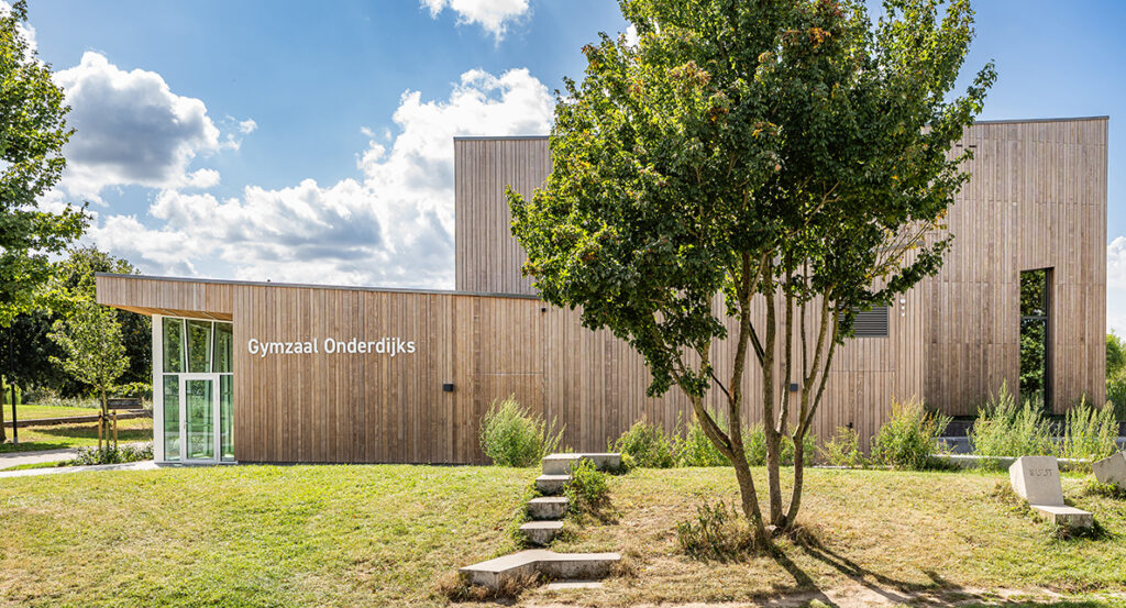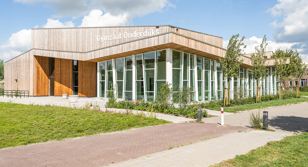 De vormgeving van de gymzaal sluit aan op de vormgeving van de omliggende bebouwing en het naastgelegen park. De laagbouw van de gymzaal ligt in de rooilijn en is vormgeven als dynamisch kappenlandschap. Het sluit aan de op glooiing van het naastgelegen park. De hoge zaal ligt gedraaid ten opzicht van de laagbouw en vormt een natuurlijk gevelwand aan het centrale plein tussen de scholen. De lessenaarskap van de zaal sluit aan op de vormgeving van de omliggende scholen. Het duurzame en circulaire gebouw is buiten en binnen vormgegeven in hout. Door de grote glazen gevel aan de parkzijde is er een optimale interactie tussen binnen en buiten. De hoofdentree ligt aan de Lange Akker. Daarnaast is er een nevenentree aan het centrale plein waar de schoolkinderen naar binnen kunnen. Aan het pleinzijde is er een buitensport voorziening met een tribunetrap en buitenberging.