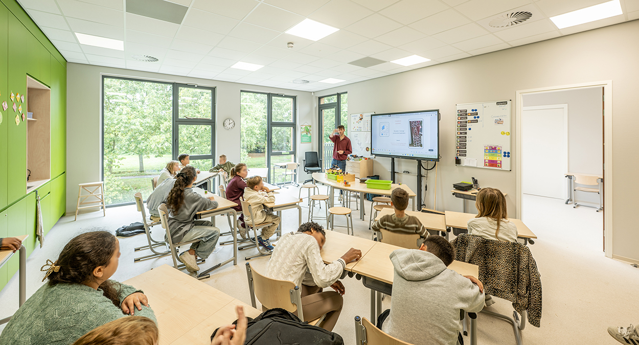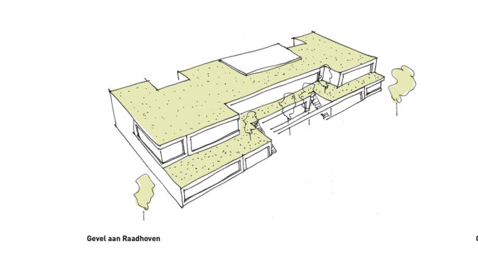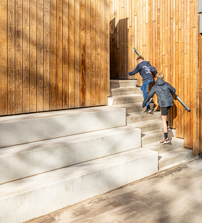 Het ontwerp van het Kindcentrum is geïnspireerd op de groene locatie en de onderwijsvisie ‘bewegend leren’. Het gebouw is vormgegeven als een compositie van grote houten vensters met veel glas. De relatie binnen-buiten met het groen en het park staan centraal en wordt versterkt door de grote dakterrassen en buitentrappen. Vanuit elk lokaal is er toegang naar het plein of een dakterras met als doel het klaslokaal en de lesruimte te vergroten en te verrijken.
