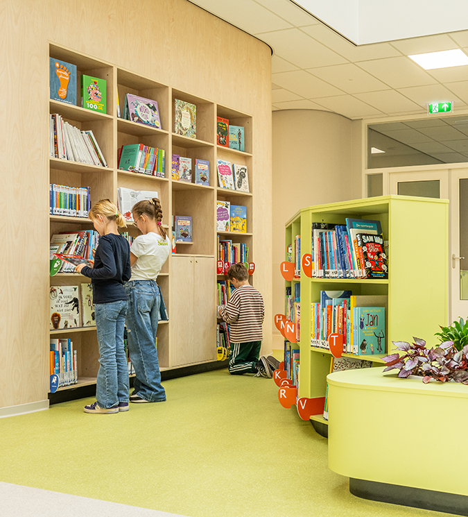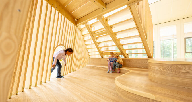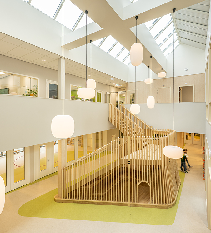 Ook het interieur van het Kindcentrum is geïnspireerd op het park; natuurlijke materialen, wandelpaden door het gebouw en in de centrale hal is de trap vormgegeven als wilgenhut.