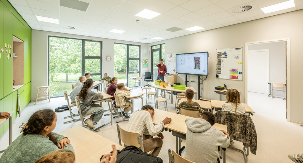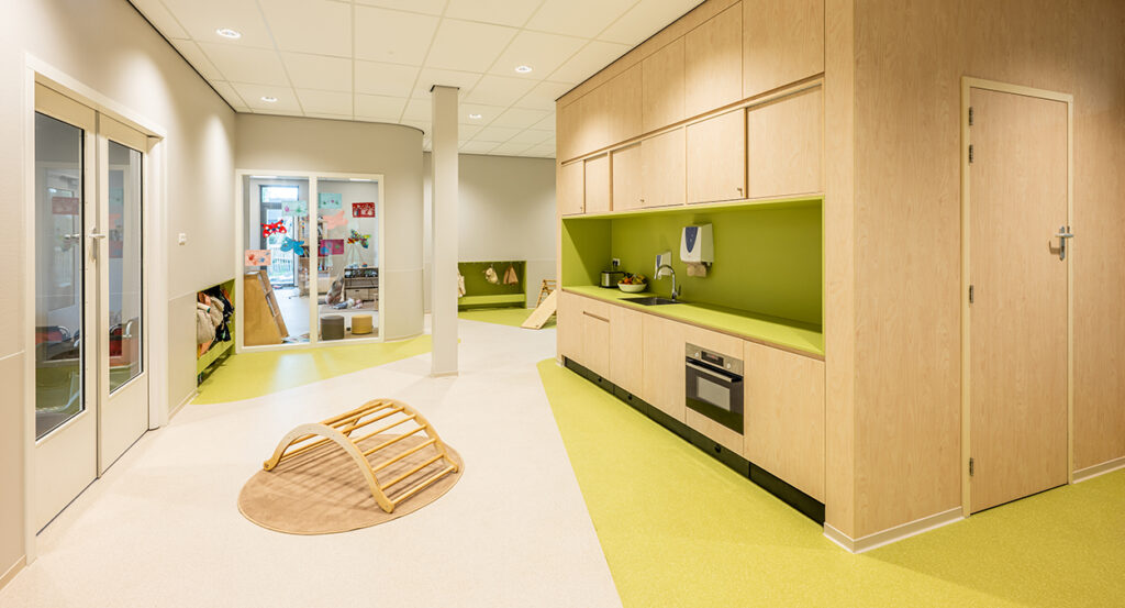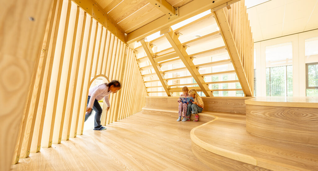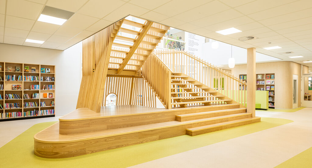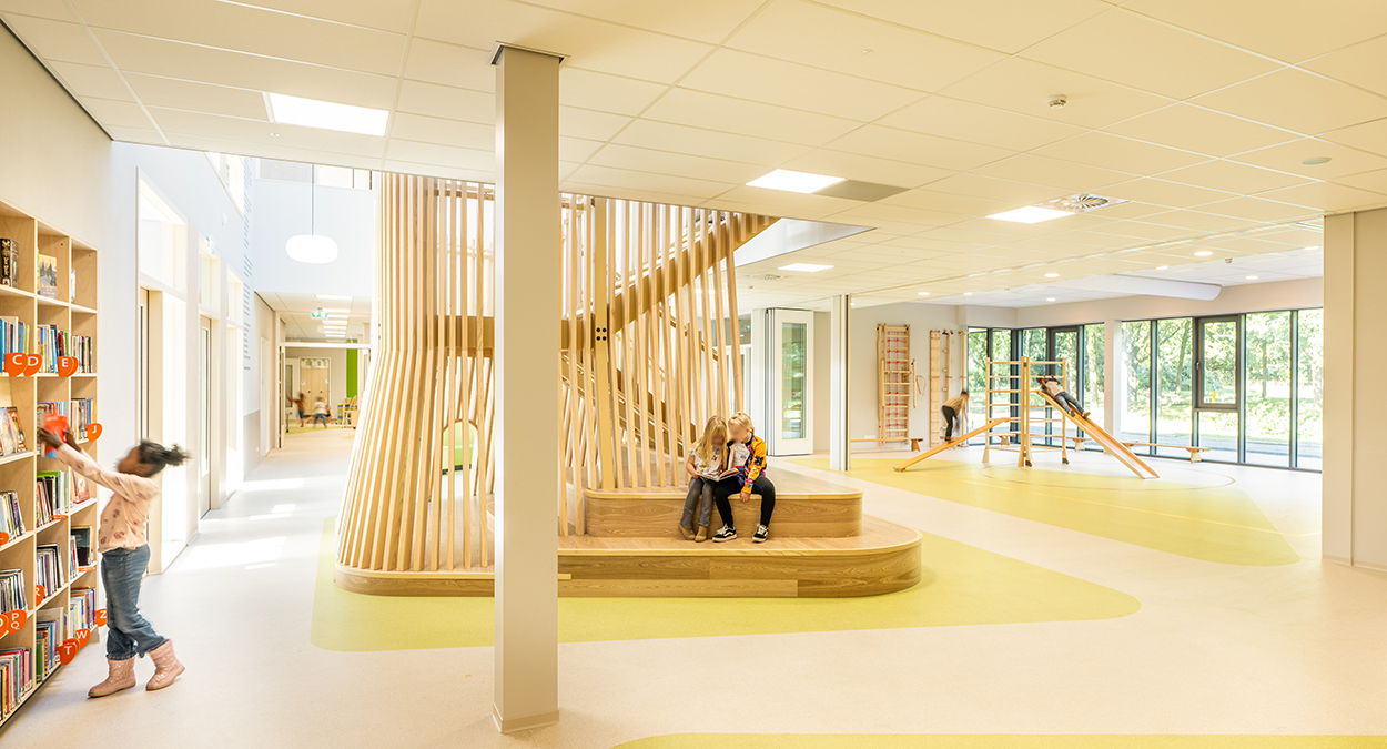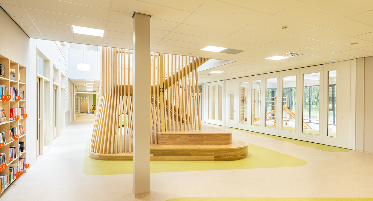 Ook het interieur van het Kindcentrum is geïnspireerd op het park; natuurlijke materialen, wandelpaden door het gebouw en in de centrale hal is de trap vormgegeven als wilgenhut.