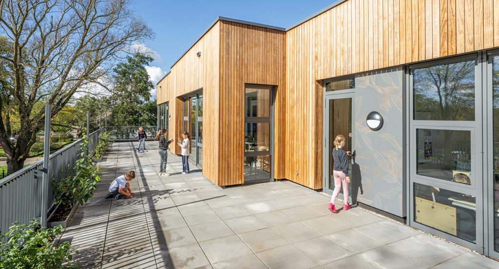 Het ontwerp van het Kindcentrum is geïnspireerd op de groene locatie en de onderwijsvisie ‘bewegend leren’. Het gebouw is vormgegeven als een compositie van grote houten vensters met veel glas. De relatie binnen-buiten met het groen en het park staan centraal en wordt versterkt door de grote dakterrassen en buitentrappen. Vanuit elk lokaal is er toegang naar het plein of een dakterras met als doel het klaslokaal en de lesruimte te vergroten en te verrijken.