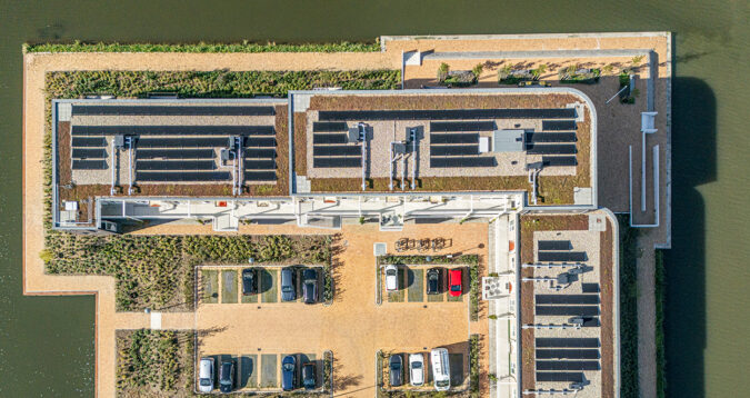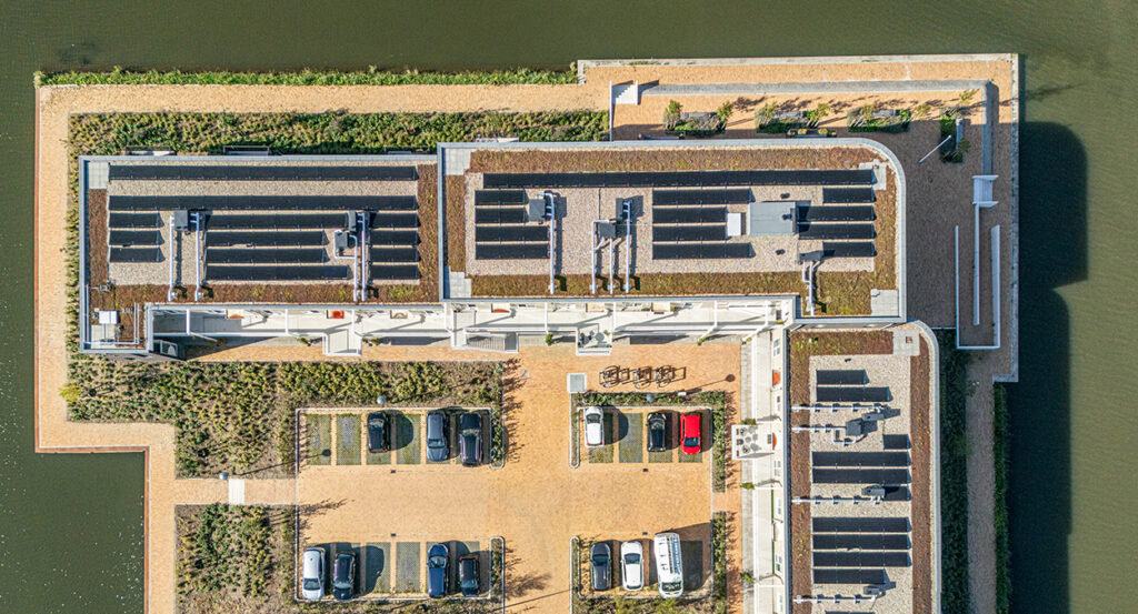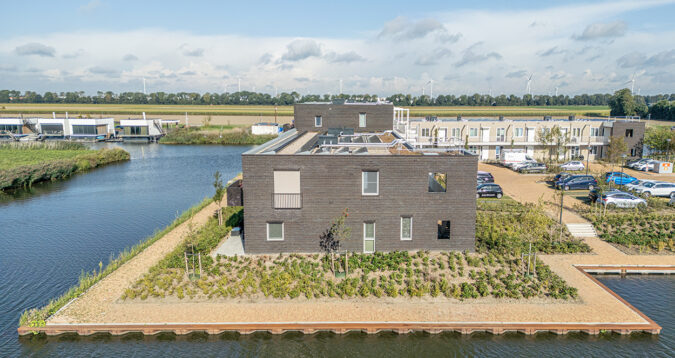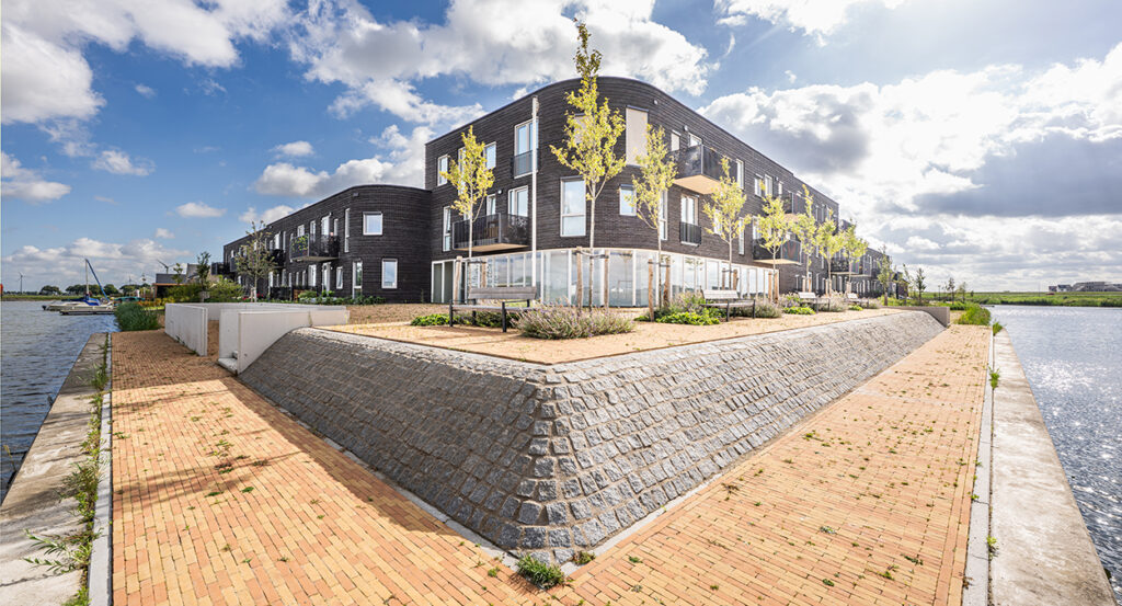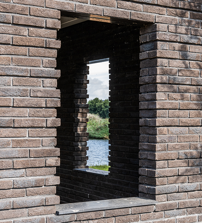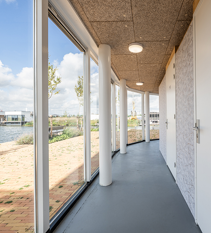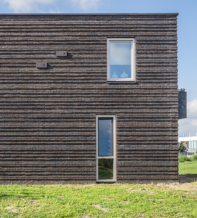 Het zwartblauwe, verspringende metselwerk vormt de buitenkant van de schelp. De binnenzijde is zachter en lichter van kleurstelling. Het optillen van het volume op de hoek versterkt de signaalfunctie van de verbinding naar het Wolderwijd en creëert een logische verbinding tussen het binnenhof en de waterkant. Met onder andere PV-panelen, een groen dak, geïntegreerde nestvoorzieningen, een groene inrichting van het binnenhof en een hybride constructie met houtskeletbouw gevelelementen wordt invulling gegeven aan de Duurzame Top 11 van de gemeente Zeewolde.
