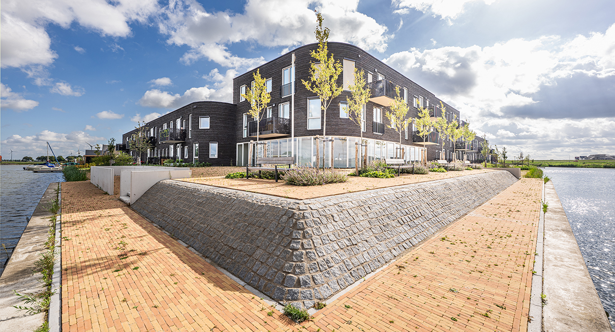 Met het concept van de schelp wordt ingespeeld op de verschillende karakteristieken van de locatie, met enerzijds de publieke ruimte aan de waterkant en anderzijds het groene binnenhof met parkeerplaatsen.