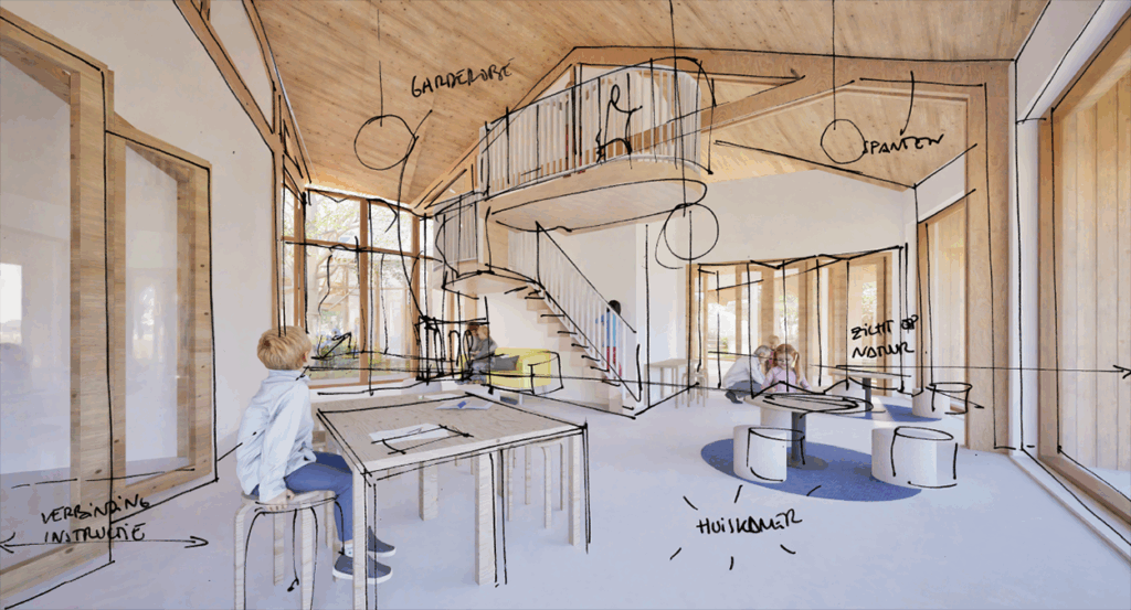 Dit project sluit perfect aan bij onze manier van werken: co-creatie, luisteren en dromen omzetten in ruimte en sfeer. We kijken ernaar uit om samen met de kinderen en de gemeenschap dit unieke centrum tot leven te brengen.