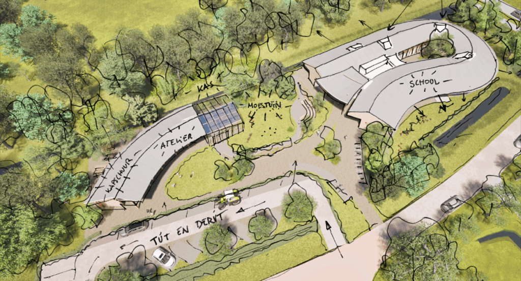 Agora-onderwijs draait om autonomie, nieuwsgierigheid en persoonlijke groei. Geen lokalen, maar huiskamers, ateliers en stiltewerkplekken. Geen vaste vakken, maar leren vanuit eigen vragen en uitdagingen. Binnen-buiten is een vanzelfsprekend onderdeel, er is veel ruimte voor buitenonderwijs. Voor ons als architectenbureau is dit een inspirerende manier van werken: het vraagt om een gebouw dat niet alleen functioneert, maar ook nieuwsgierigheid en creativiteit uitnodigt. Alle ideeën, dromen en vragen van de kinderen en de leerkrachten vormen het hart van het ontwerp. Van weidse uitzichten over het Friese landschap tot plekken voor ontdekking, samenwerking en reflectie, alles is gericht op het stimuleren van persoonlijke groei.