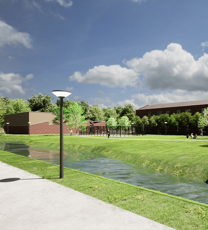 Het sluitstuk van de Leer- en sportcampus van Winkler Prins wordt letterlijk gevormd door de gymzaal die beide functies verbindt en huisvest. Alles komt hier bij elkaar; de rode loper die alle delen van de sportcampus aan elkaar rijgt, landt hier over de brug op de schoolcampus. Het gebouw zelf is vanaf deze groene campus vanuit alle gebouwen bereikbaar, maar heeft ook een in-uitgang naar de sportterreinen. Door de zaal enigszins ‘oversized’ te maken, is deze makkelijk te splitsen zodat twee groepen tegelijk kunnen sporten. De zaal voldoet aan alle normen, zodat alle mogelijke zaalsporten hier beoefend kunnen worden.